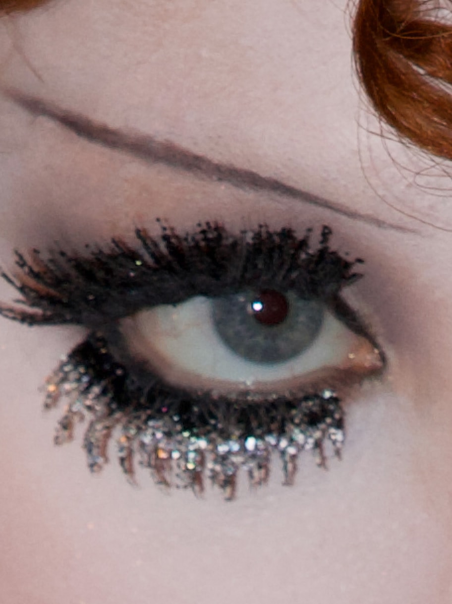 - Aplica volumen y longitud infinitos con M·A·CStack Mascara. Luego, coloca M·A·C Lash / 76 Supermodel Lash and M·A·C Lash / 80 Romantic Lash en las líneas superior e inferior, y usa Dazzleshadow Liquid Eye Shadow para adherir glitter en las puntas.